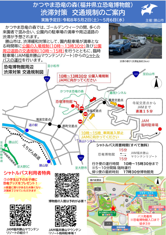 勝山市は、渋滞緩和対策として、園内駐車場が満車となる時間帯に公園の入場規制(10時~13時30分)及び公園周辺道路の交通規制(10時~15時)を行うとともに、臨時駐車場(JAM福井勝山マウンテンリゾート)からのシャトルバスの運行を行います。